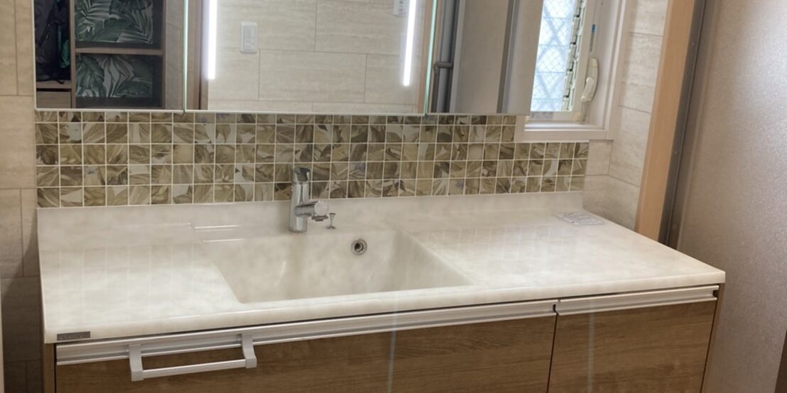 ボタニカルなアクセントタイルを化粧台鏡面下に貼りました。